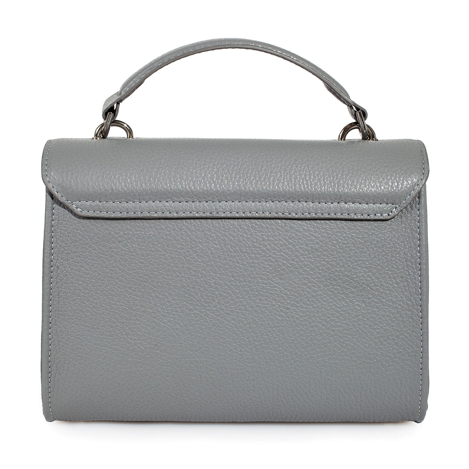 Gray genuine leather handbag from ukrainian designer Katerina Fox. The internal space of a bag is equipped with three spacious compartments and two patch-pockets and one zipper pocket. One of the spacious compartments is closed with a zipper. The bag is closed with a clasp. The bottom of the bag is protected with metal legs. There is a long handle that allows you to wear the bag on the shoulder. The kit also includes a storage bag.