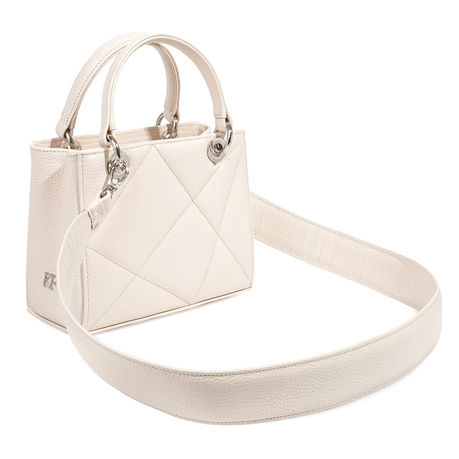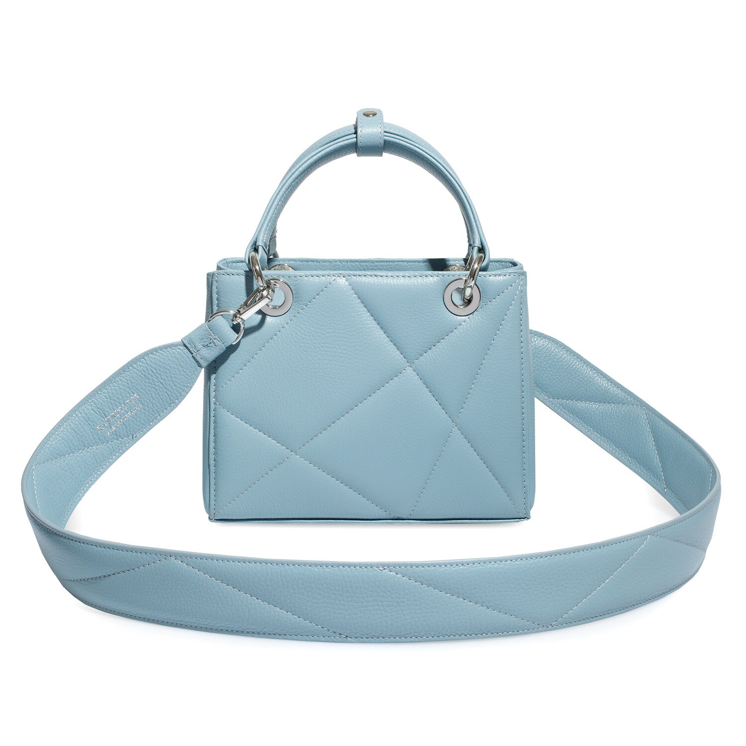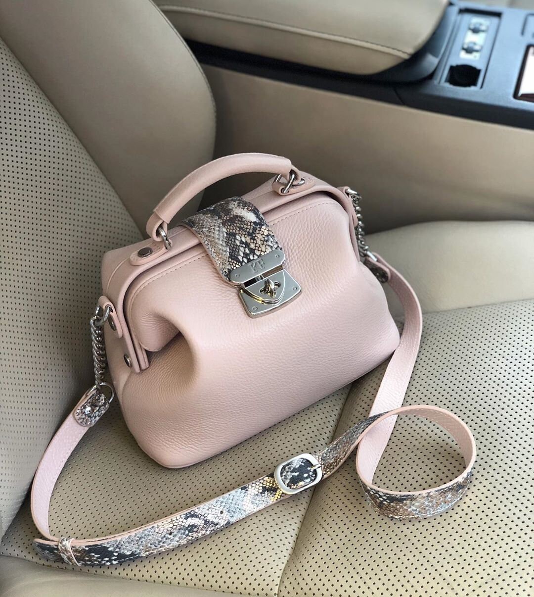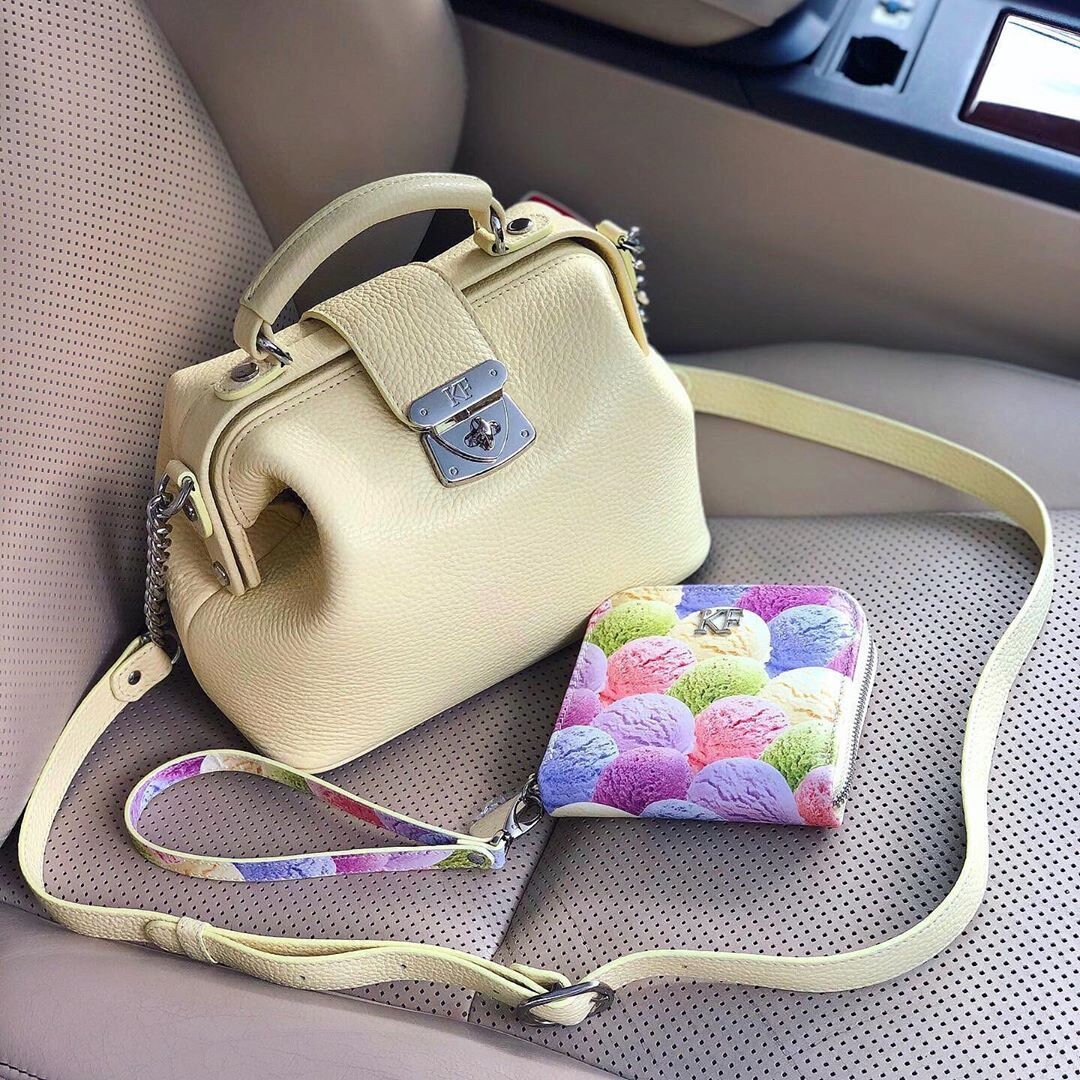 Mint genuine leather handbag from Ukrainian designer Katerina Fox. The internal space of a bag is equipped with three spacious compartments and two patch-pockets and one zipper pocket. One of the spacious compartments is closed with a zipper. The bag is closed with a clasp. The bottom of the bag is protected with metal legs. There is a long handle that allows you to wear the bag on the shoulder. The kit also includes a storage bag.