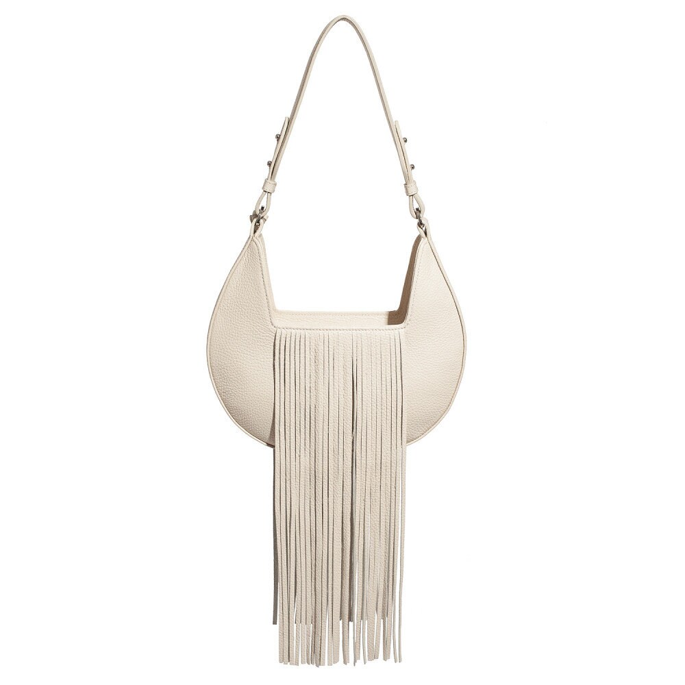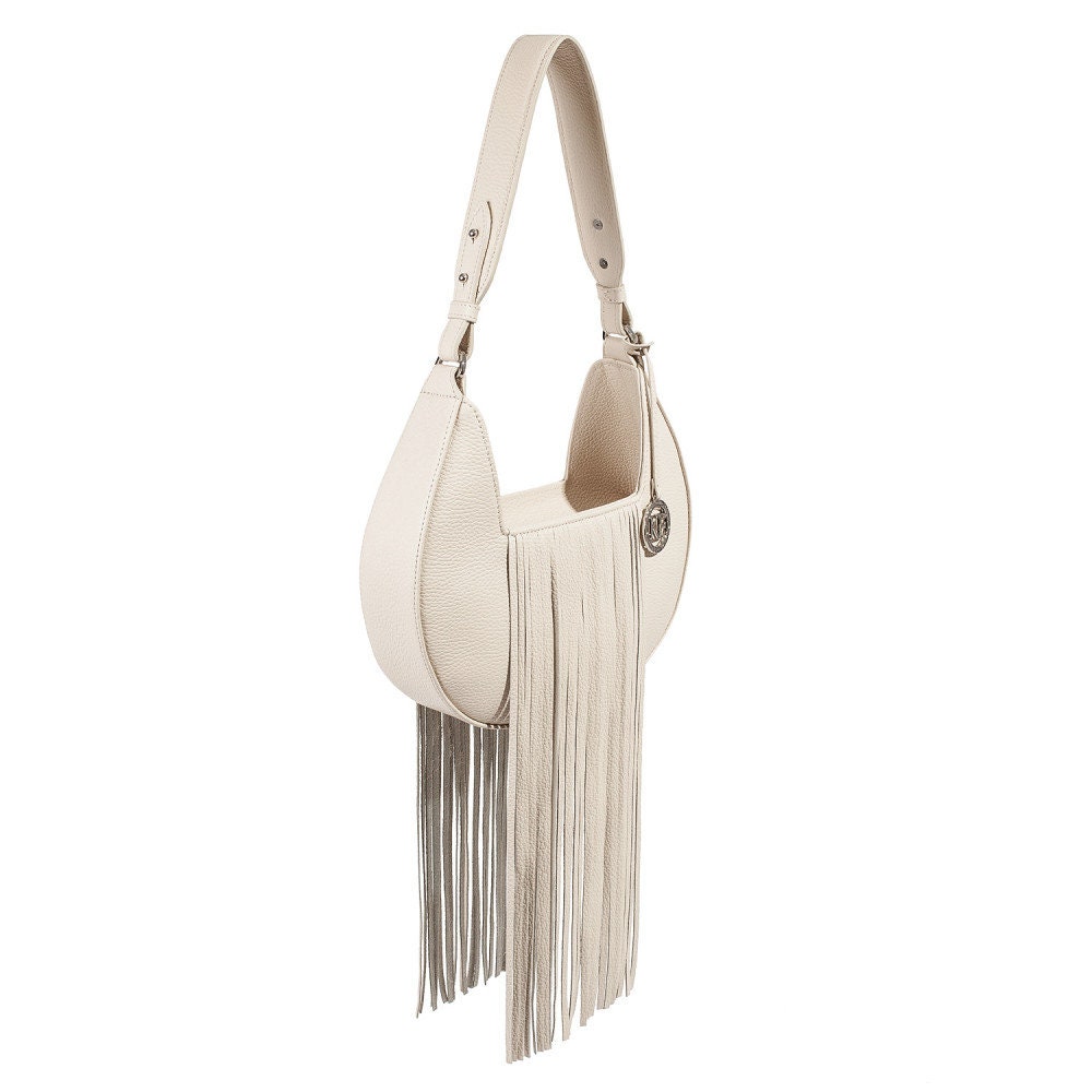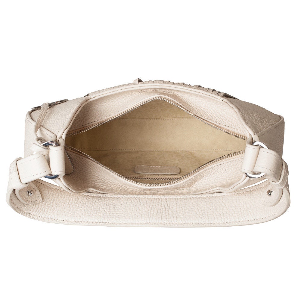 Light beige genuine leather woman shoulder bag from ukrainian designer Katerina Fox. Fashionable and elegant modern bag KF for bright girls and women. This bag is able to attract attention and highlight your exquisite taste. Inside the bag is one large compartment and two pockets for a small items, close the bag on the zip. The bag is comfortable to wear on the shoulder.