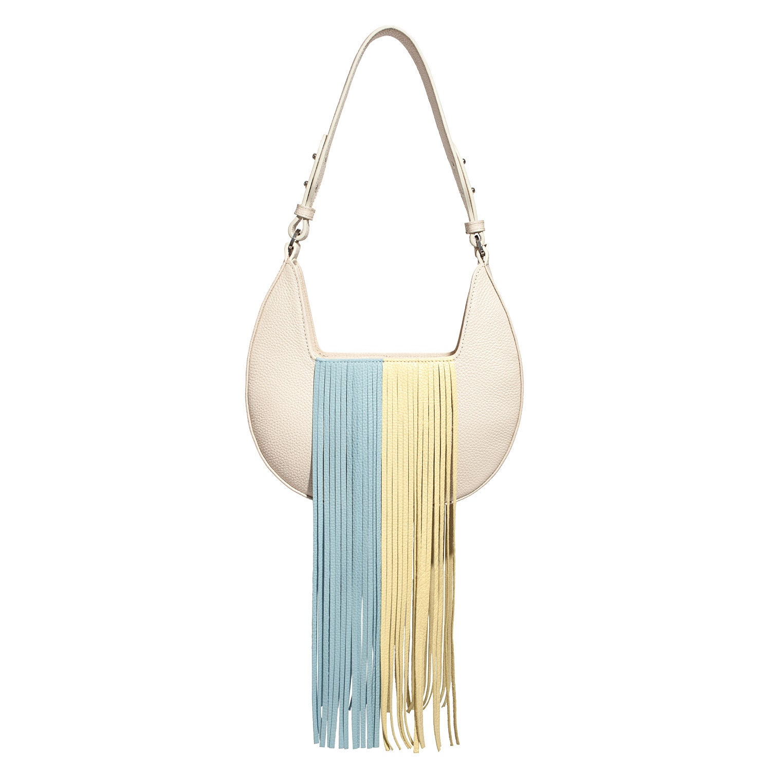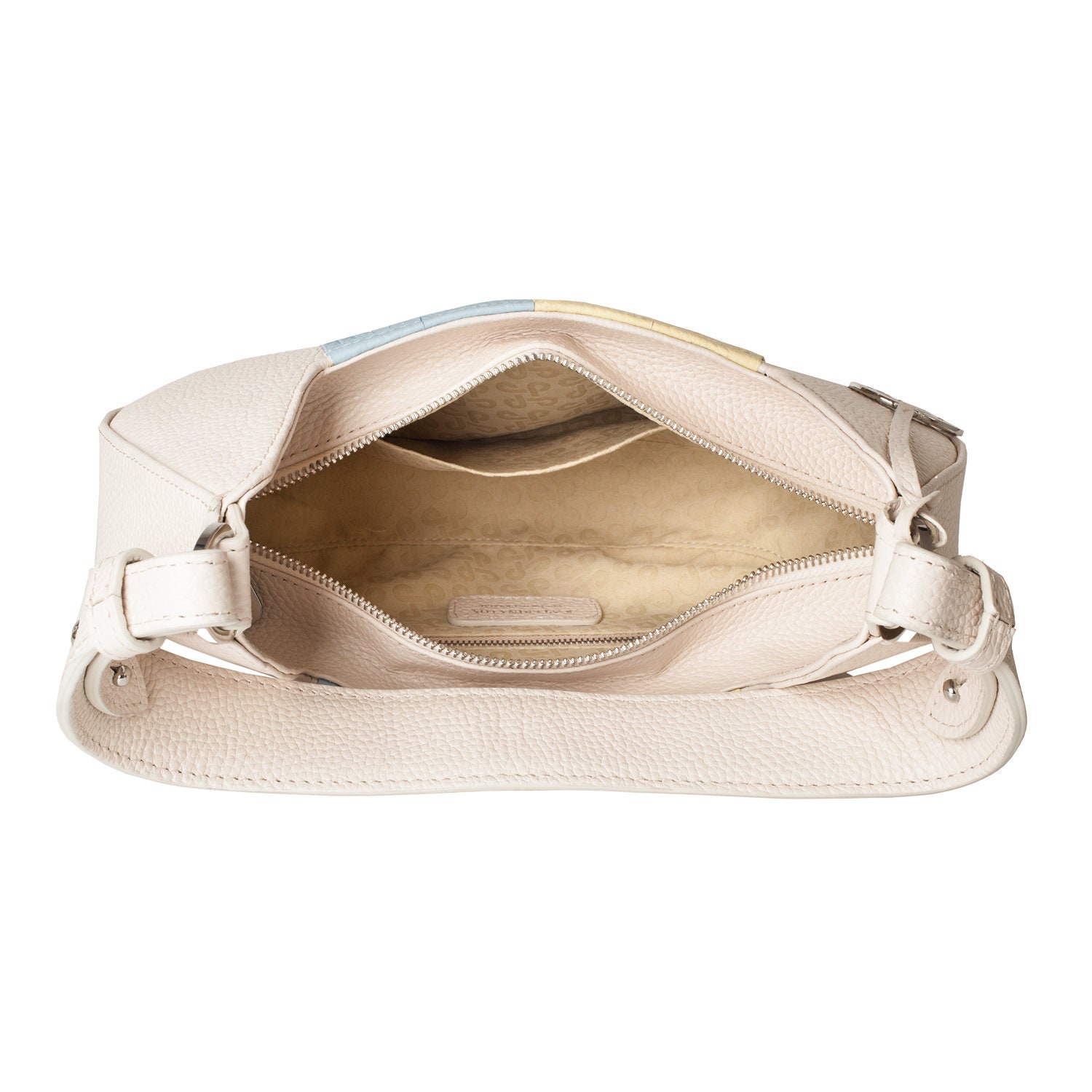 Light beige genuine leather woman shoulder bag from ukrainian designer Katerina Fox. Fashionable and elegant modern bag KF for bright girls and women. This bag is able to attract attention and highlight your exquisite taste. Inside the bag is one large compartment and two pockets for a small items, close the bag on the zip. The bag is comfortable to wear on the shoulder.