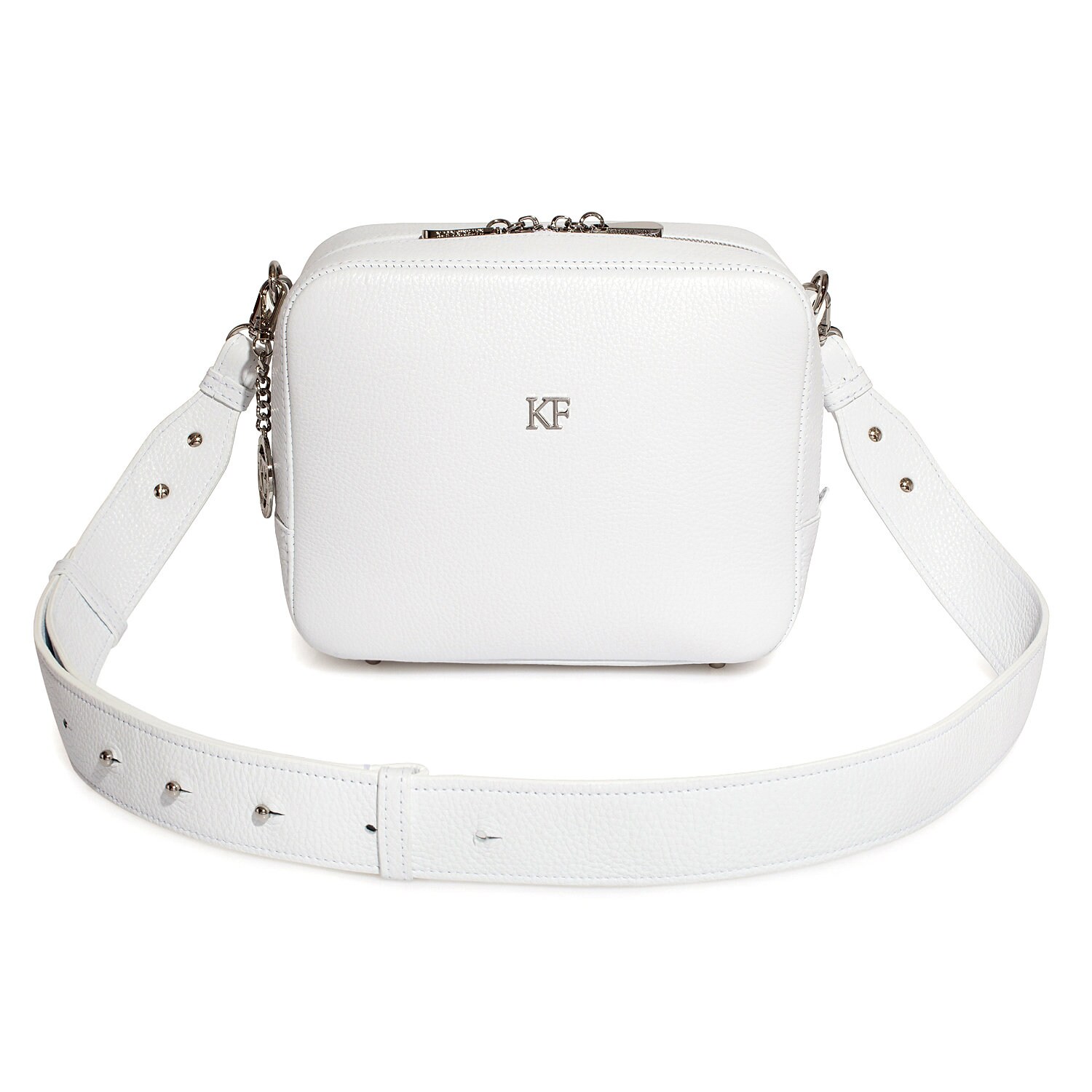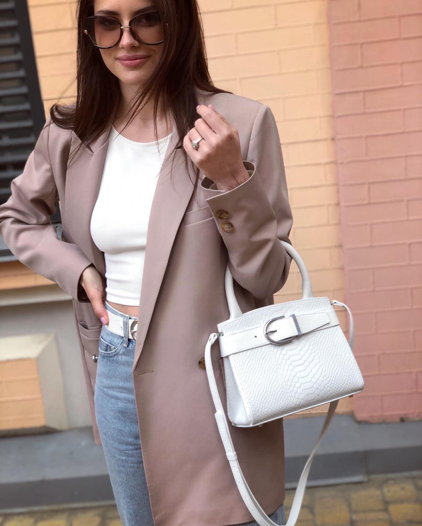 Gray beige genuine leather woman shoulder bag from ukrainian designer Katerina Fox. Fashionable and elegant modern bag KF for bright girls and women. This bag is able to attract attention and highlight your exquisite taste. The internal space of a bag is equipped with one spacious compartment and one zipper pocket. The bag is closed with a zipper. The length of the strap is adjustable. The kit also includes a storage bag.